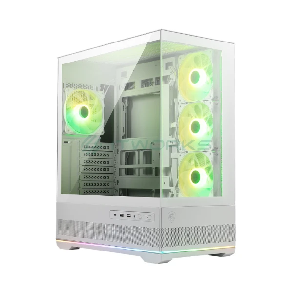 კომპიუტერის ქეისი: MSI MAG Pano 110R PZ - Mid Tower, ATX, Desktop Gaming PC Case, Panoramic Tempered Glass, Up to 360mm Radiator Support, Type-C - with Pre Installed 4x120mm ARGB Fans (White)